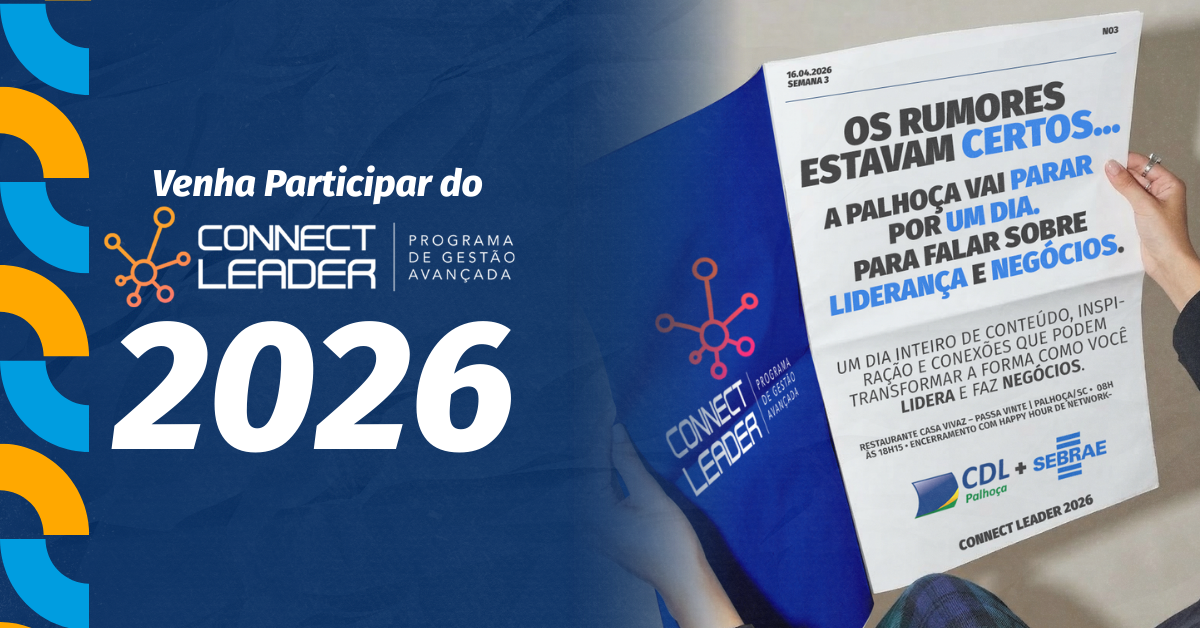 A CDL Palhoça, em parceria com o SEBRAE, apresenta o Connect Leader 2026, um seminário imersivo de um dia inteiro voltado para líderes, gestores, empreendedores e profissionais que desejam evoluir sua performance em liderança, gestão de pessoas, resultados e uso estratégico da tecnologia.