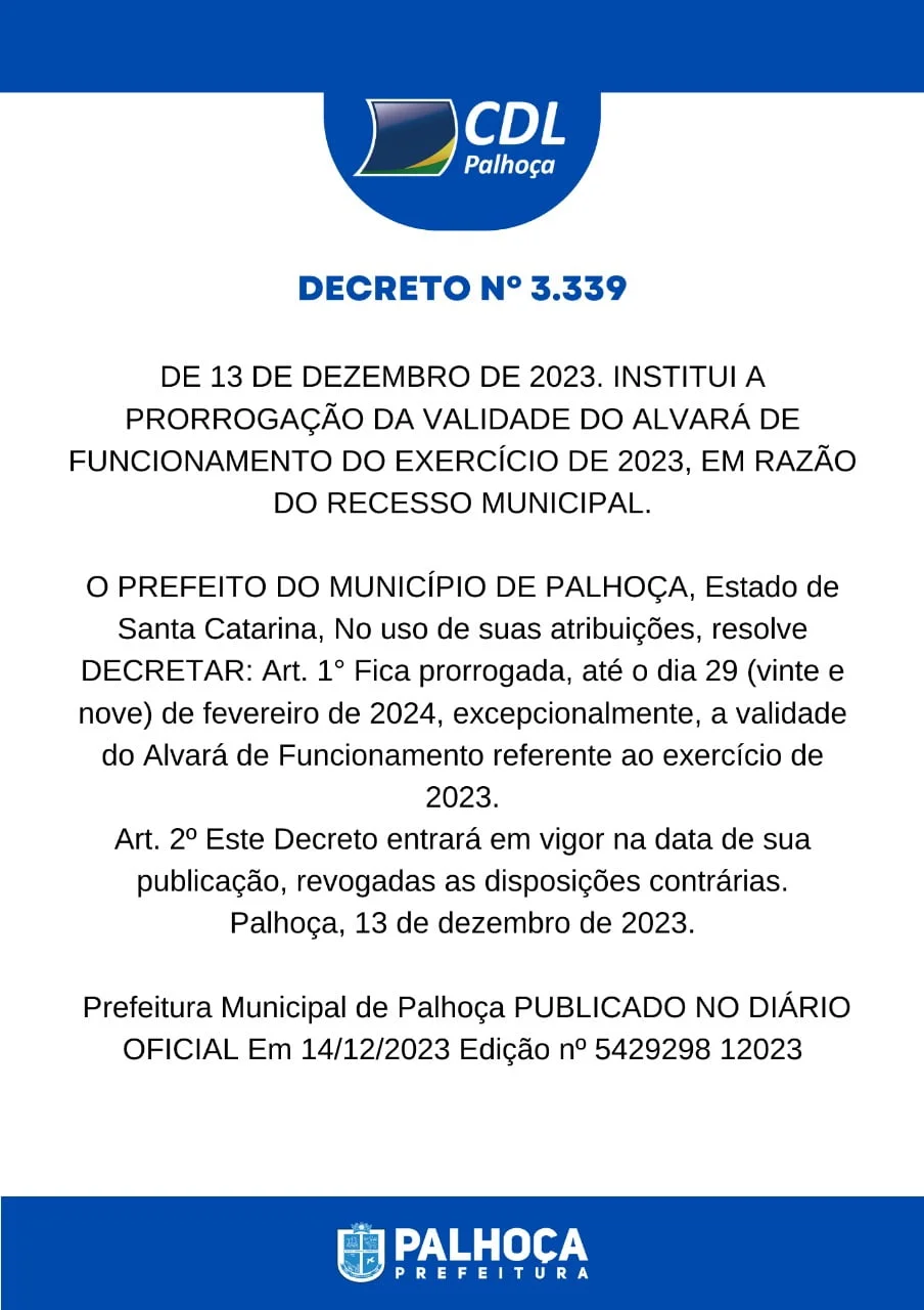 Através desse decreto, o Prefeito do Município de Palhoça determinou a prorrogação excepcional da validade do Alvará de Funcionamento referente ao exercício de 2023. Os empresários terão agora até o dia 29 de fevereiro de 2024 para realizar a renovação, proporcionando um alívio considerável durante as festividades de final de ano.