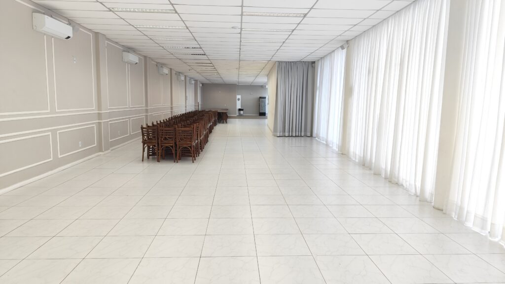 O Espaço Ivone Weiss, conhecido como Multiuso, da CDL Palhoça, é climatizado e comporta até 150 pessoas, oferecendo uma infraestrutura completa para diferentes tipos de eventos. O ambiente conta com 24 mesas retangulares, 10 mesas quadradas e 178 cadeiras de madeira, além de cozinha equipada com geladeira, fogão industrial com forno, cervejeira, micro-ondas e churrasqueira (louças não inclusas). Possui banheiros feminino, masculino, acessível e fraldário, sonorização ambiente (não indicada para eventos de grande porte) e internet WI-FI, com limpeza inclusa no valor da locação (exceto recolhimento do lixo). O espaço é liberado a partir das 09h00 e deve ser desocupado até 05h00 do dia seguinte, sendo necessário retirar todo e qualquer material relacionado à locação. Para locações no final de semana, a chave deve ser retirada até 16h30 de sexta-feira, e para horários comerciais, no mesmo dia da locação.