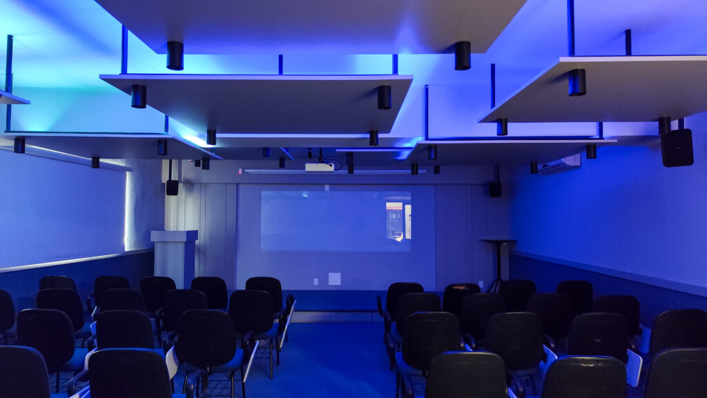 Com capacidade para 50 pessoas o auditório Cambirela oferece uma infraestrutura completa para reuniões e eventos, incluindo data show instalado, microfone, som, quadro branco e internet wi-fi. O ambiente conta com cadeiras universitárias, ar-condicionado, LED colorido (RGB), 8 mesas auxiliares, espaço para coffee break no hall e copa compartilhada, além de fechadura eletrônica para maior segurança. A sala está disponível nos períodos da manhã (08h às 12h), tarde (13h às 17h) e noite (18h às 22h), com valores diferenciados.