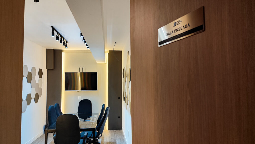 A sala de reunião Enseada tem capacidade para 6 pessoas e oferece uma infraestrutura completa para encontros profissionais, incluindo internet wi-fi, TV SMART, ar-condicionado e copa compartilhada. O ambiente ainda conta com um espaço instagramável, ideal para registros e reuniões mais descontraídas. A sala está disponível para locação com valores diferenciados.