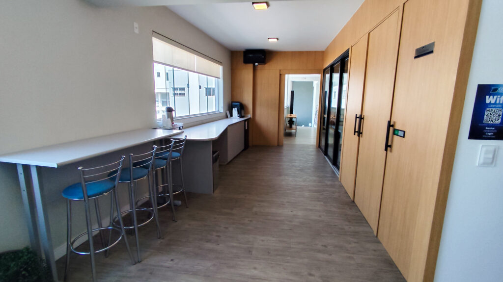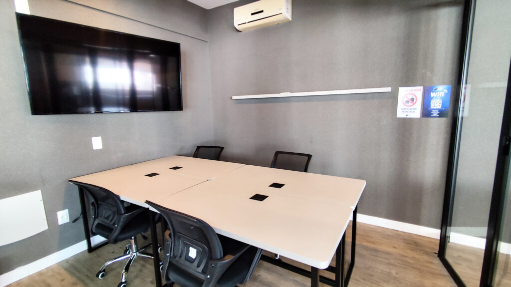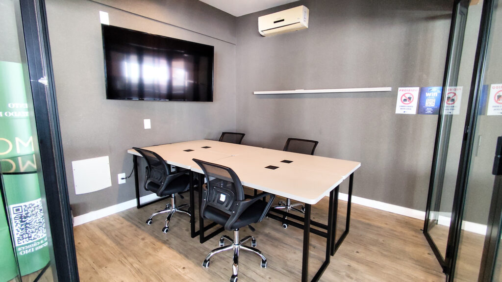 Para reuniões privativas ou coworking, disponibilizamos um espaço completo com mesa ampla, TV com entrada HDMI e WI-FI, ideal para encontros profissionais e trabalho colaborativo. O ambiente ainda conta com uma copa compartilhada equipada com micro-ondas, pia e frigobar, oferecendo toda a praticidade necessária para o dia a dia.